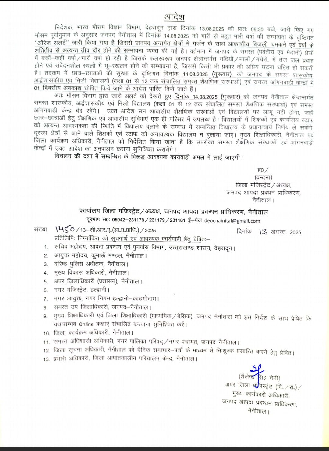 इसके तहत 14 अगस्त 2025 (गुरुवार) को जनपद नैनीताल के अंतर्गत संचालित सभी शासकीय, अशासकीय एवं निजी विद्यालय (कक्षा 1 से 12 तक) सभी आंगनबाड़ी केंद्र में एक दिवसीय अवकाश रहेगा।