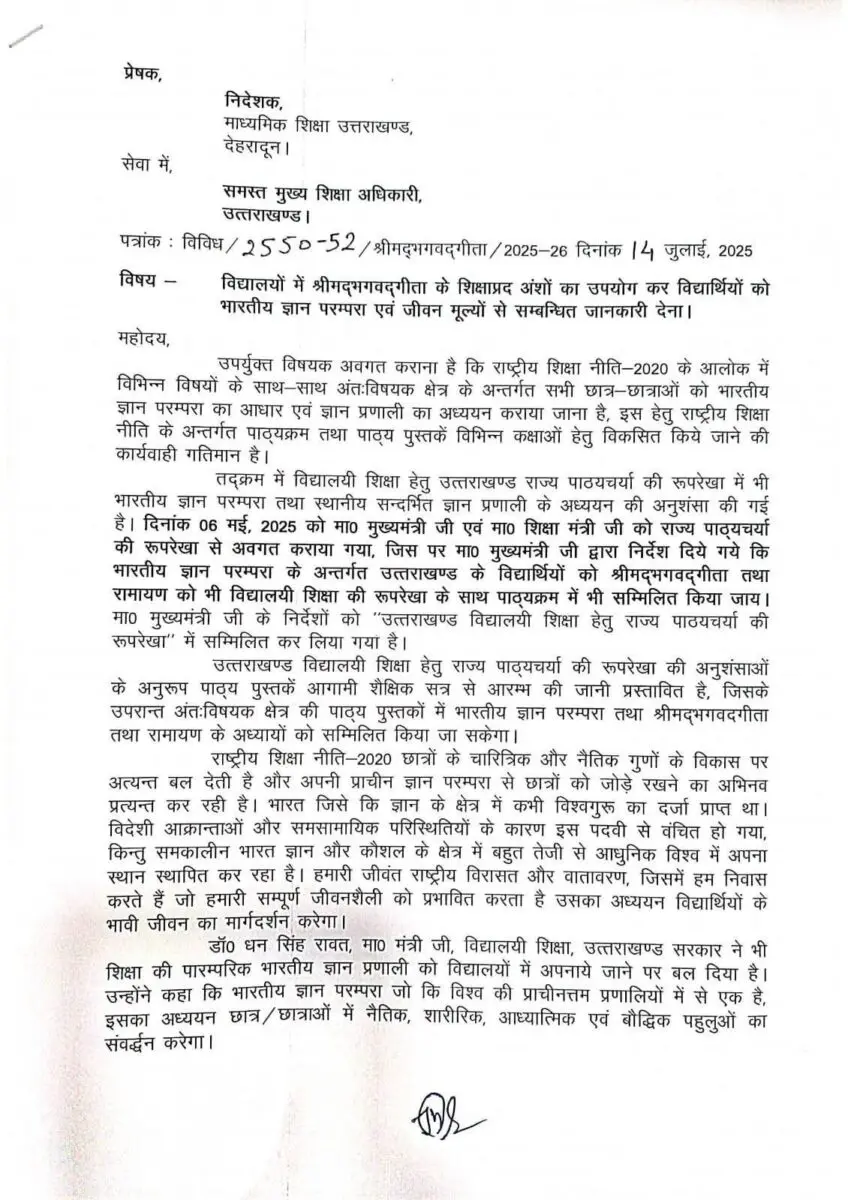 देहरादून, 15 जुलाई 2025: उत्तराखंड सरकार राष्ट्रीय शिक्षा नीति-2020 (NEP-2020) के तहत स्कूली पाठ्यक्रम में भारतीय ज्ञान परंपरा और जीवन मूल्यों को एकीकृत करने की दिशा में महत्वपूर्ण कदम उठा रही है। इस पहल के तहत, श्रीमद्भगवद्गीता और रामायण के शिक्षाप्रद अंशों को आगामी शैक्षणिक सत्र से विद्यार्थियों के लिए अंतःविषयक क्षेत्रों की पाठ्यपुस्तकों में शामिल किया जाएगा।