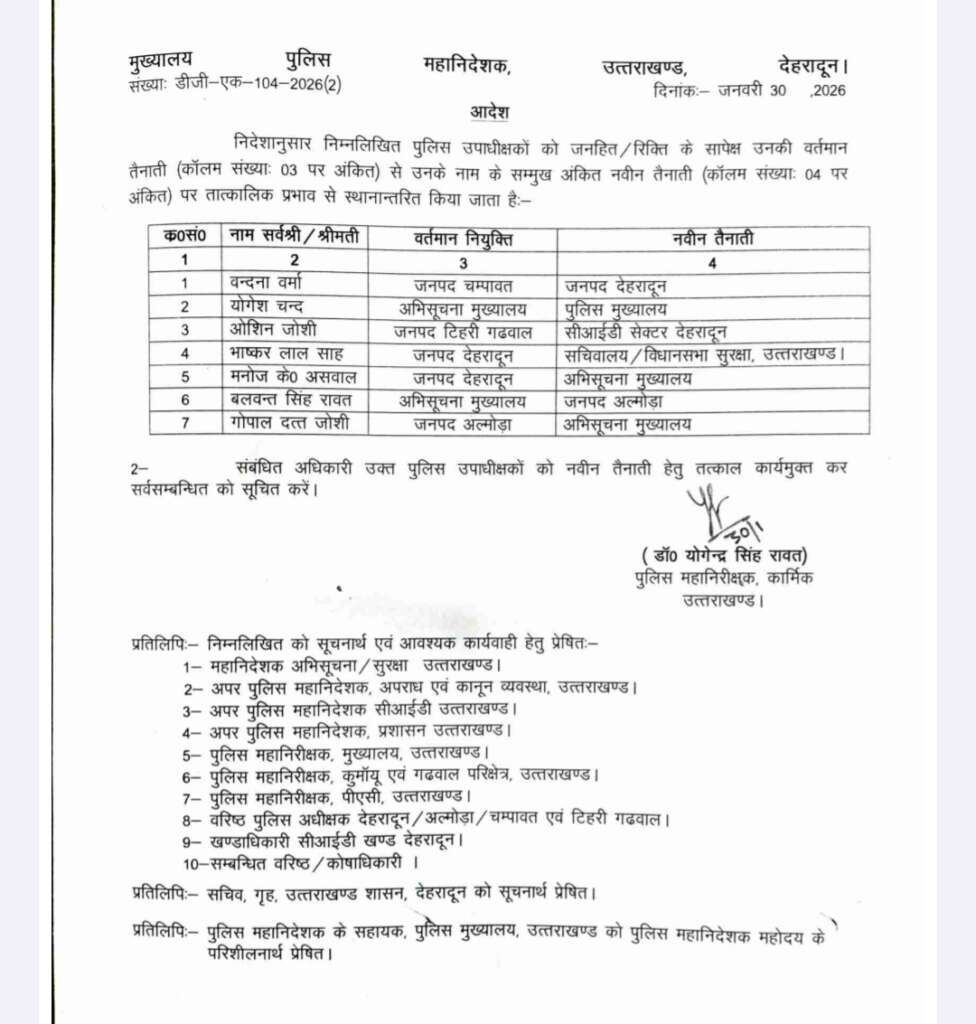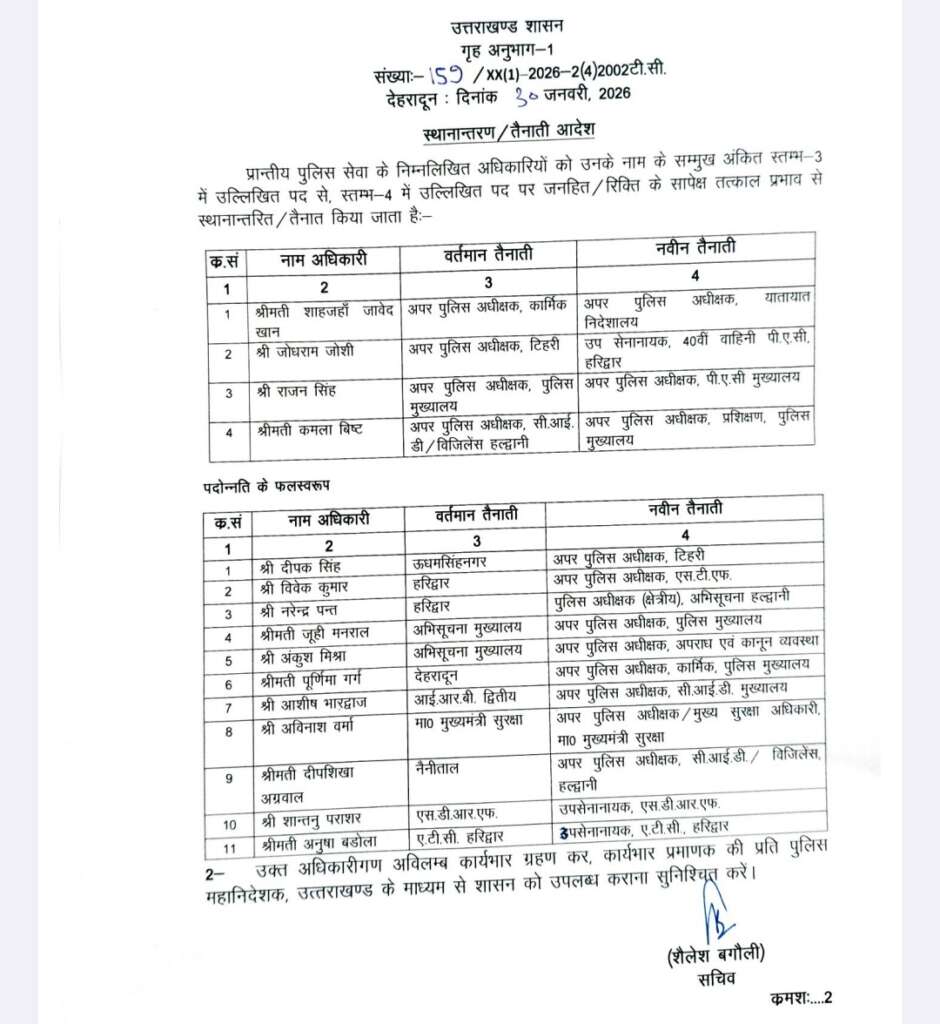 देहरादून। उत्तराखंड पुलिस महकमे में एक बार फिर बड़ा प्रशासनिक भूचाल आया है। शासन ने एक साथ 11 पुलिस अधिकारियों के तबादले और तैनाती के आदेश जारी कर दिए हैं। यह आदेश गृह अनुभाग-1 की ओर से 30 जनवरी 2026 को जारी किया गया, जिसे तत्काल प्रभाव से लागू कर दिया गया है।