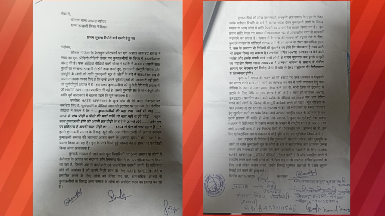 नैनीताल, 2 सितंबर 2025। सोशल मीडिया प्लेटफॉर्म फेसबुक पर एक अज्ञात अकाउंट द्वारा कुमाऊंनी समाज के विरुद्ध आपत्तिजनक और भ्रामक ऑडियो-वीडियो पोस्ट किए जाने का मामला प्रकाश में आया है। इस मामले को लेकर एडवोकेट मोहन काण्डपाल, एडवोकेट प्रकाश चंद्र जोशी और कमल कन्याल सहित अन्य जागरूक नागरिकों ने हल्द्वानी थाने में लिखित तहरीर देकर कार्रवाई की मांग की है।
