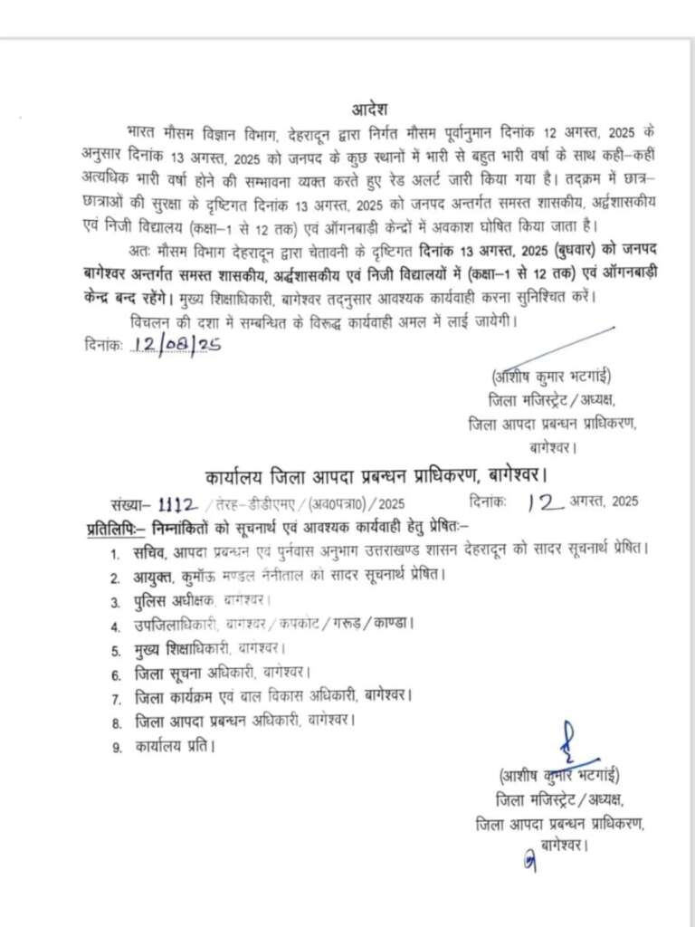 मुख्य शिक्षाधिकारी, बागेश्वर को निर्देश दिए गए हैं कि आदेश के अनुसार आवश्यक कार्यवाही सुनिश्चित की जाए। प्रशासन ने लोगों से अपील की है कि खराब मौसम के दौरान अनावश्यक यात्रा से बचें और सावधानी बरतें।