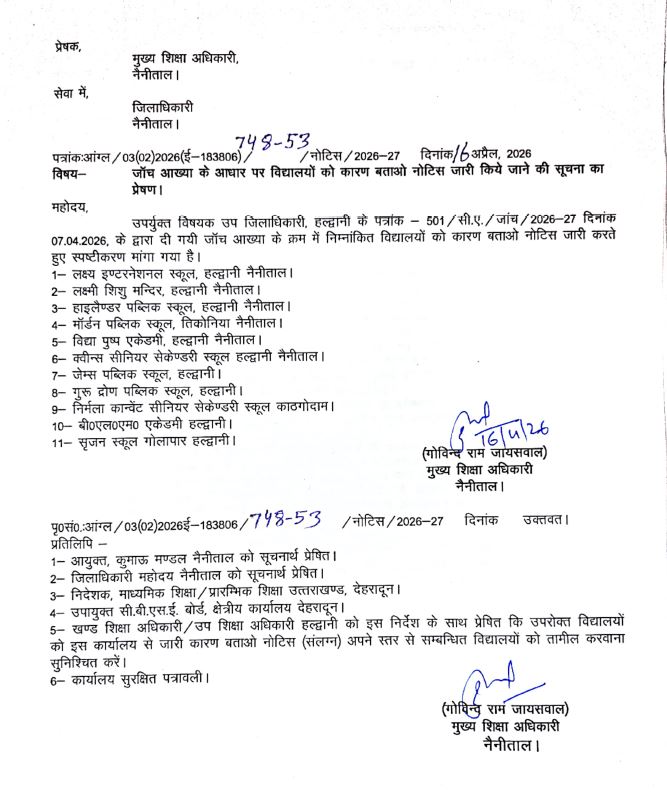 नैनीताल में बड़ा एक्शन: हल्द्वानी, रामनगर समेत 45 निजी स्कूलों पर कार्रवाई, कारण बताओ नोटिस जारी