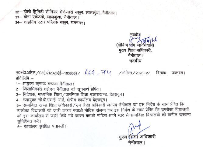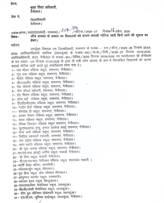 नोटिस के दायरे में आए रामनगर, भवाली, भीमताल और लालकुआं क्षेत्र के 31 स्कूल