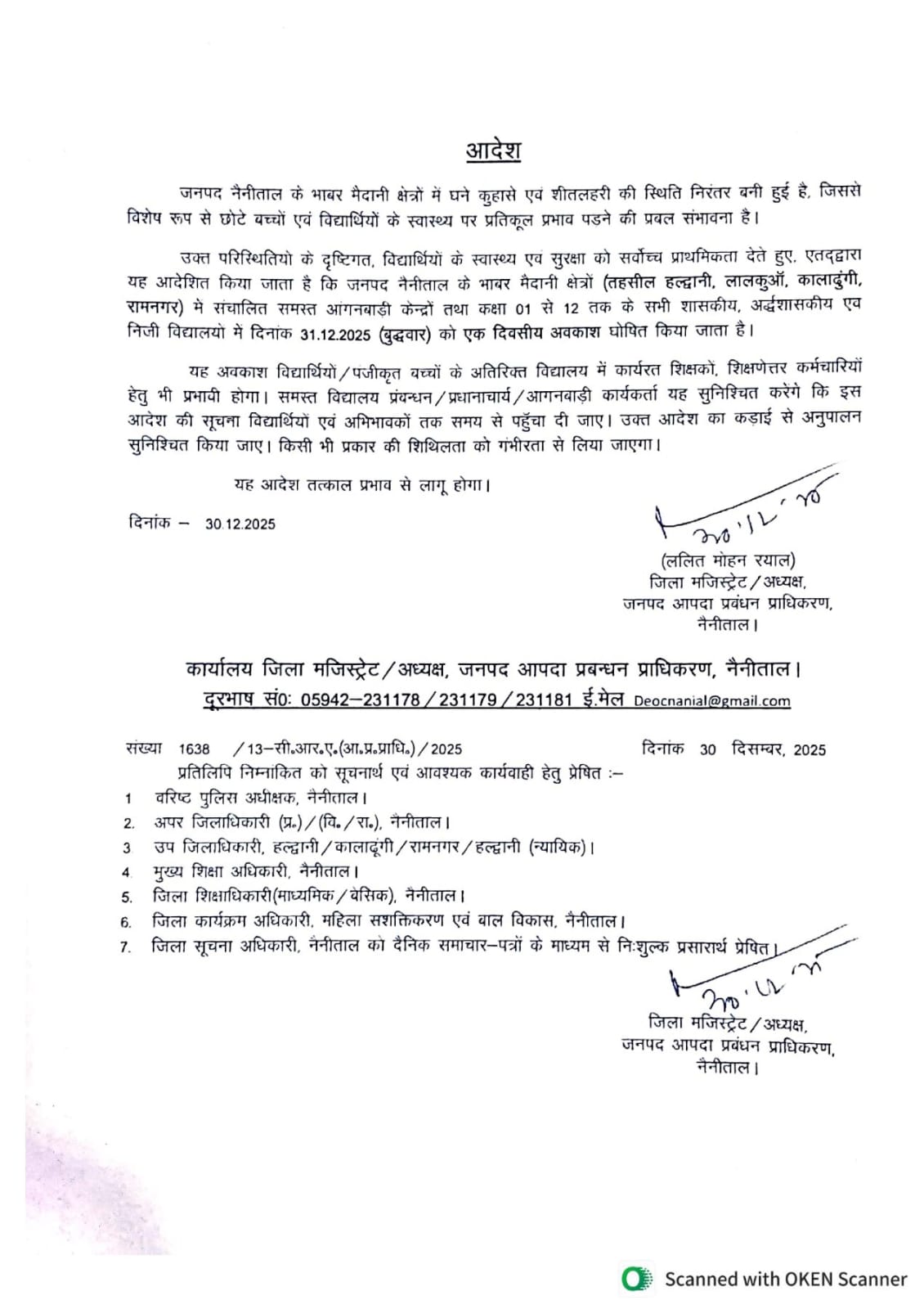 हल्द्वानी | नैनीताल जिले में कड़ाके की ठंड, घने कोहरे और शीतलहर को देखते हुए प्रशासन ने बड़ा फैसला लिया है। बच्चों के स्वास्थ्य और सुरक्षा को प्राथमिकता देते हुए जिला प्रशासन ने 31 दिसंबर 2025 (बुधवार) को जिले के मैदानी क्षेत्रों में सभी स्कूलों और आंगनबाड़ी केंद्रों में एक दिवसीय अवकाश घोषित कर दिया है।
