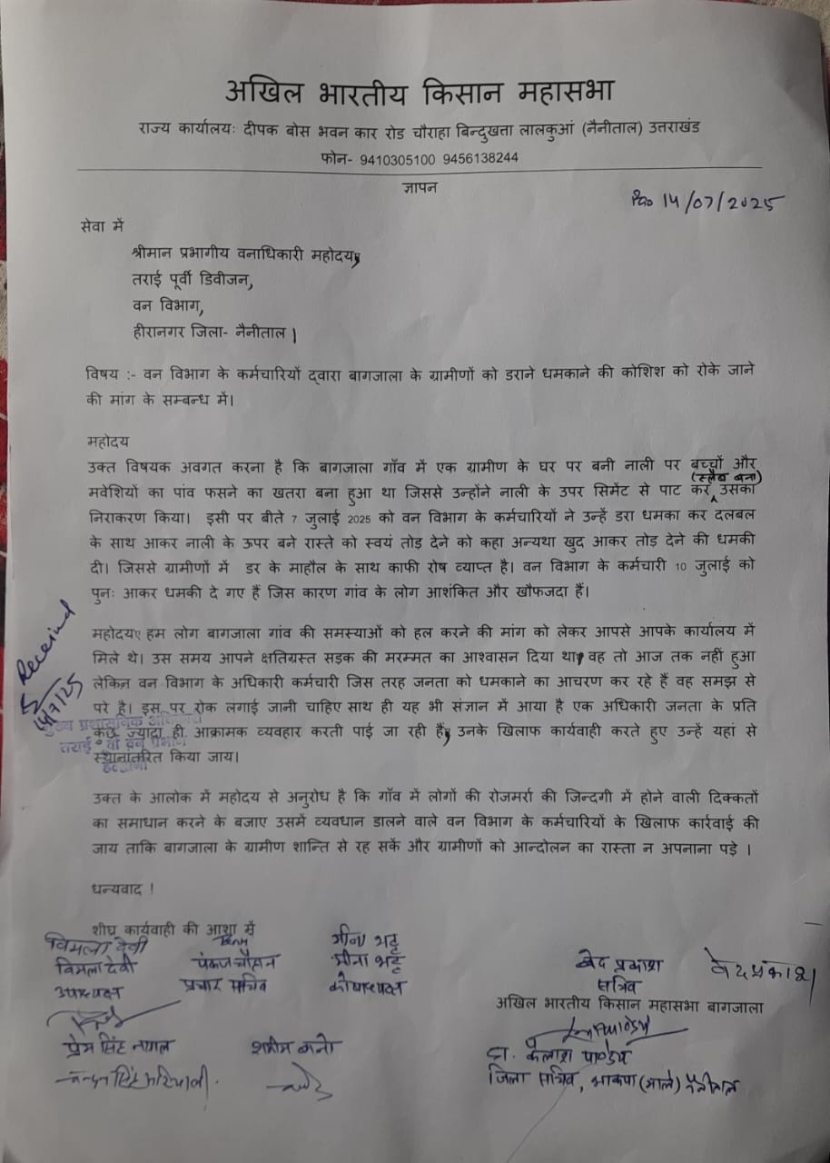 डीएफओ को दिए ज्ञापन में किसान महासभा बागजाला द्वारा कहा गया कि, हम लोग बागजाला गांव की समस्याओं को हल करने की मांग को लेकर आपसे आपके कार्यालय में मिले थे। उस समय आपने क्षतिग्रस्त सड़क की मरम्मत का आश्वासन दिया था, वह तो आज तक नहीं हुआ लेकिन वन विभाग के अधिकारी कर्मचारी जिस तरह जनता को धमकाने का आचरण कर रहे हैं वह समझ से परे है।