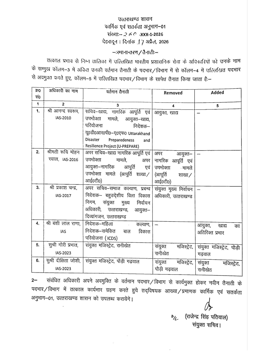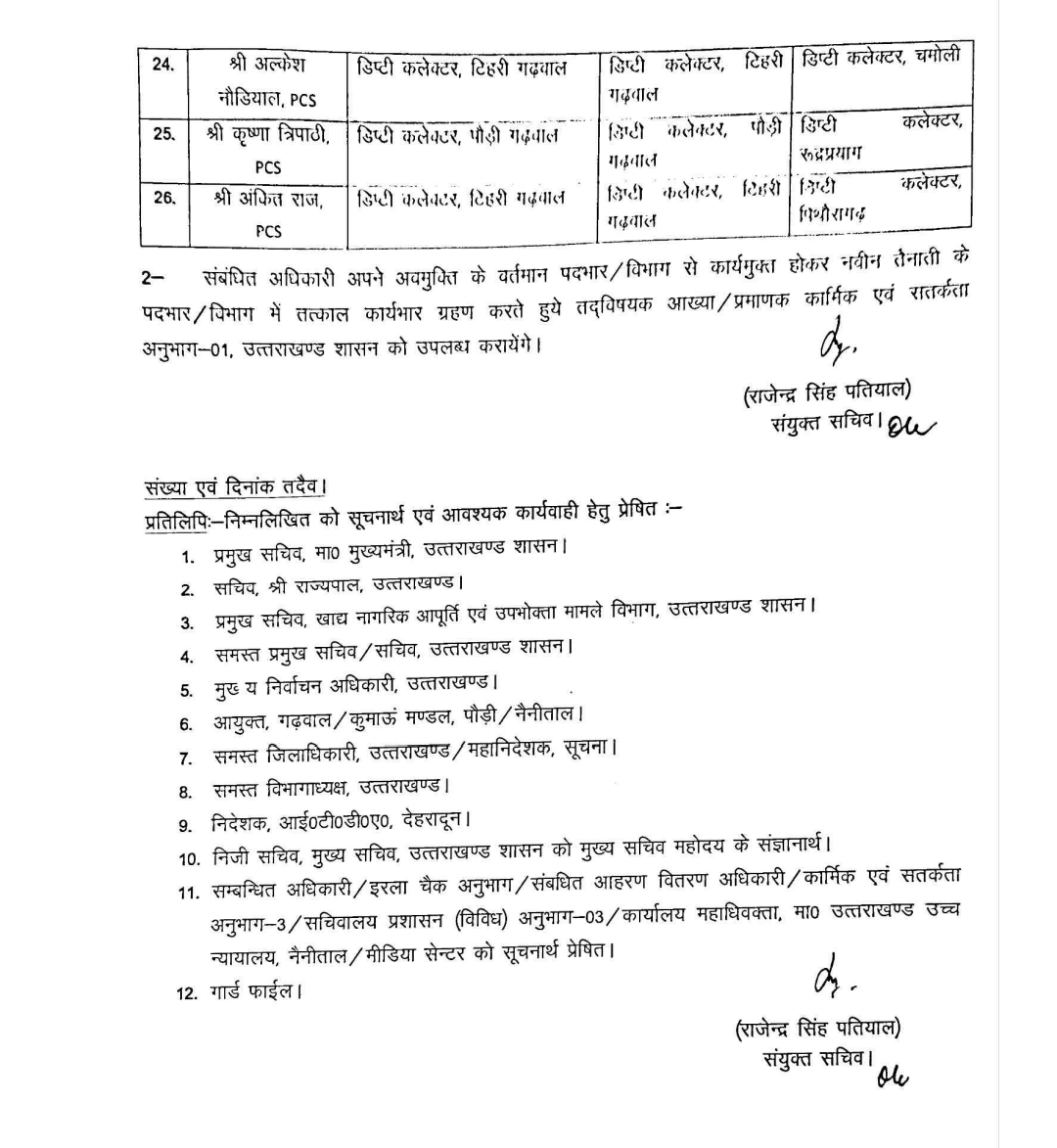 देहरादून: उत्तराखंड शासन ने गुरुवार को बड़ा प्रशासनिक फेरबदल करते हुए कई आईएएस और पीसीएस अधिकारियों के स्थानांतरण एवं नई तैनाती के आदेश जारी किए हैं। कार्मिक एवं सतर्कता अनुभाग-01 द्वारा जारी आदेश के अनुसार तत्काल प्रभाव से अधिकारियों को उनके वर्तमान पदों से कार्यमुक्त करते हुए नई जिम्मेदारियां सौंपी गई हैं।