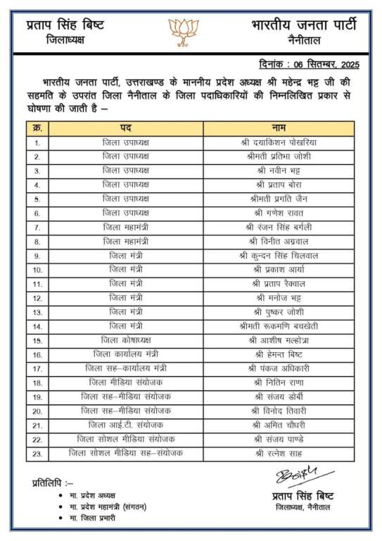 नैनीताल। भारतीय जनता पार्टी, उत्तराखंड के प्रदेश अध्यक्ष महेंद्र भट्ट की सहमति से नैनीताल जिले की नई भाजपा जिला कार्यकारिणी की घोषणा कर दी गई है। जिला अध्यक्ष प्रताप सिंह बिष्ट ने प्रेस विज्ञप्ति जारी कर पदाधिकारियों के नाम घोषित किए।