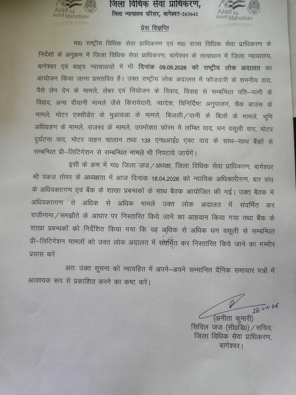 इस संबंध में 18 अप्रैल 2026 को जिला जज/अध्यक्ष पंकज तोमर की अध्यक्षता में न्यायिक अधिकारियों, बार संघ और बैंक शाखा प्रबंधकों के साथ बैठक आयोजित की गई। बैठक में अधिक से अधिक मामलों को लोक अदालत में संदर्भित कर निस्तारण करने पर जोर दिया गया।