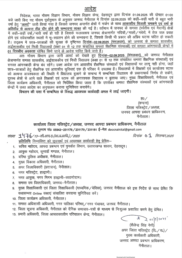 मौसम विभाग द्वारा जारी चेतावनी व मौसम पूर्वांनुमान के सम्बन्ध में जानकारी देते हुए जिलाधिकारी व अध्यक्ष जिला आपदा प्रबंधन प्राधिकरण नैनीताल वंदना ने अवगत कराया कि संभावित आपदा जोखिमों जैसे भूस्खलन, सड़क अवरोध, जलभराव, अंधड़ एवं नदी-नालों में तेज बहाव को ध्यान में रखते हुए विद्यार्थियों की सुरक्षा हेतु जनपद नैनीताल में संचालित सभी शासकीय, अशासकीय एवं निजी विद्यालय (कक्षा 1 से 12 तक) एवं समस्त आंगनबाड़ी केंद्रों में दिनांक 2 सितम्बर 2025 (मंगलवार) को एक दिवसीय अवकाश रहेगा।