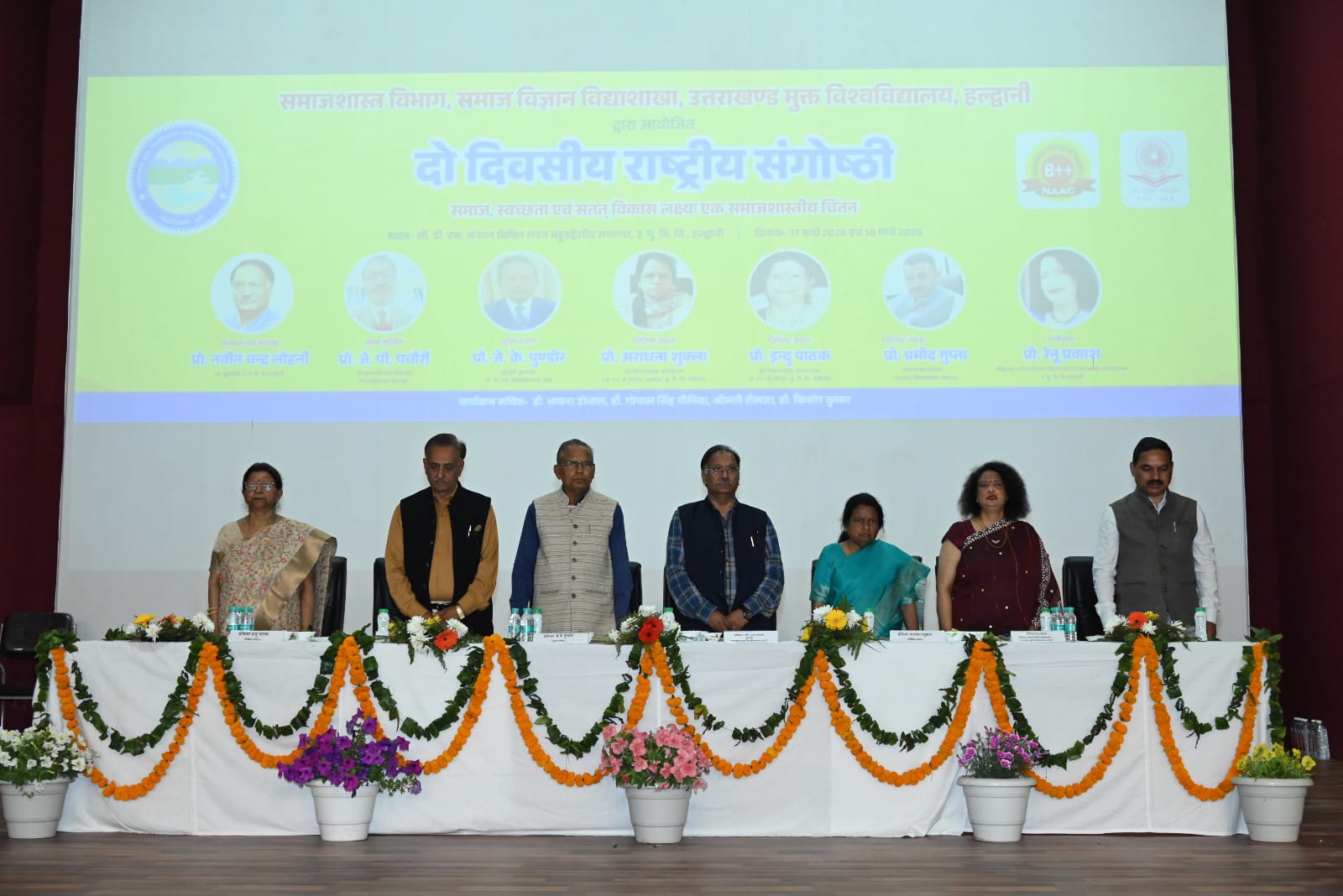हल्द्वानी। उत्तराखण्ड मुक्त विश्वविद्यालय, हल्द्वानी के समाजशास्त्र विभाग, समाज विज्ञान विद्याशाखा द्वारा “समाज, स्वच्छता एवं सतत् विकास लक्ष्यः एक समाजशास्त्रीय चिंतन” विषय पर दो दिवसीय राष्ट्रीय संगोष्ठी का शुभारम्भ 17 मार्च 2026 को सी.डी.एस. जनरल बिपिन रावत बहुउद्देशीय सभागार में हुआ। यह संगोष्ठी 17 एवं 18 मार्च तक आयोजित की जाएगी।