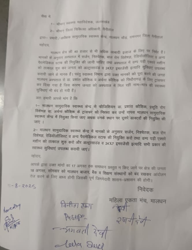 महिला एकता मंच ने सीएचसी के प्रभारी चिकित्सा अधीक्षक के माध्यम से स्वास्थ्य महानिदेशक, उत्तराखंड को ज्ञापन भेजकर फिज़ीशियन डॉ. प्रशांत कौशिक और स्त्री रोग विशेषज्ञ डॉ. अर्चना कौशिक के ट्रांसफर रद्द करने की मांग की है। साथ ही अस्पताल में मानकों के अनुसार चिकित्सकों की नियुक्ति और एक्स-रे, अल्ट्रासाउंड, रेडियोलॉजिस्ट, प्रसव, निश्चेतक व इमरजेंसी जैसी मूलभूत सुविधाएं तत्काल उपलब्ध कराने की मांग की गई है।
